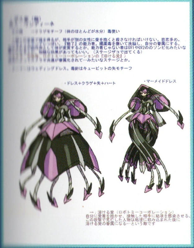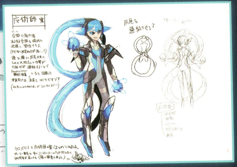 Capable of instantly identifying and supervising all kinds of spaces (possibly limited but stronger than Teseo). The head and waist tails could attack independently, and they can form "Infinite Computation" when connected, calculating the future with ○○-ed(illegible) computing power. The detailed description of Overclock in the Azure Striker Gunvolt Official Complete Works is fairly close to this.