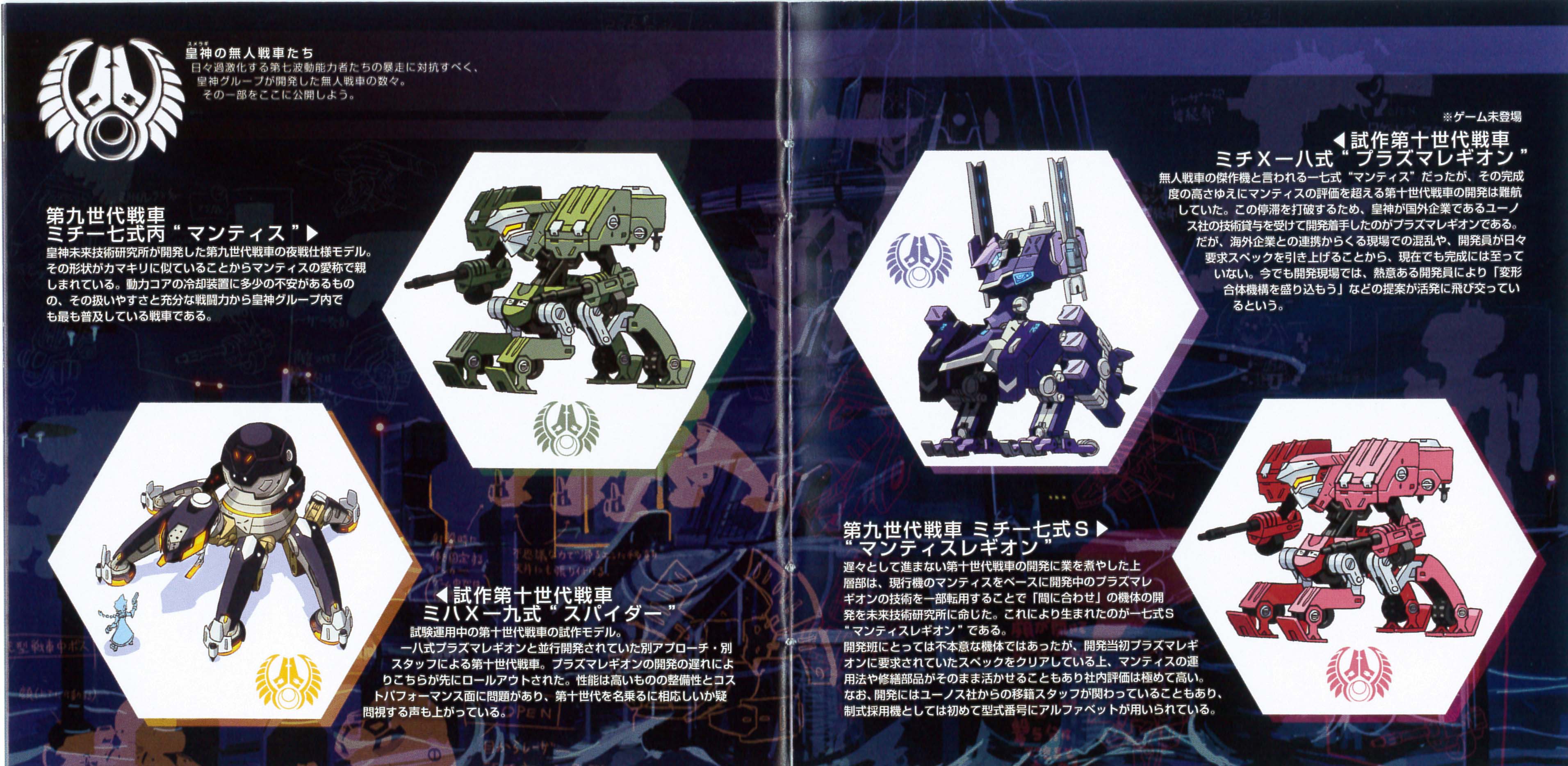 In order to face the increasing rampages by violent Septimal Adepts, the Sumeragi Group has developed many types of unmanned tanks. Here we’ll showcase some of them.