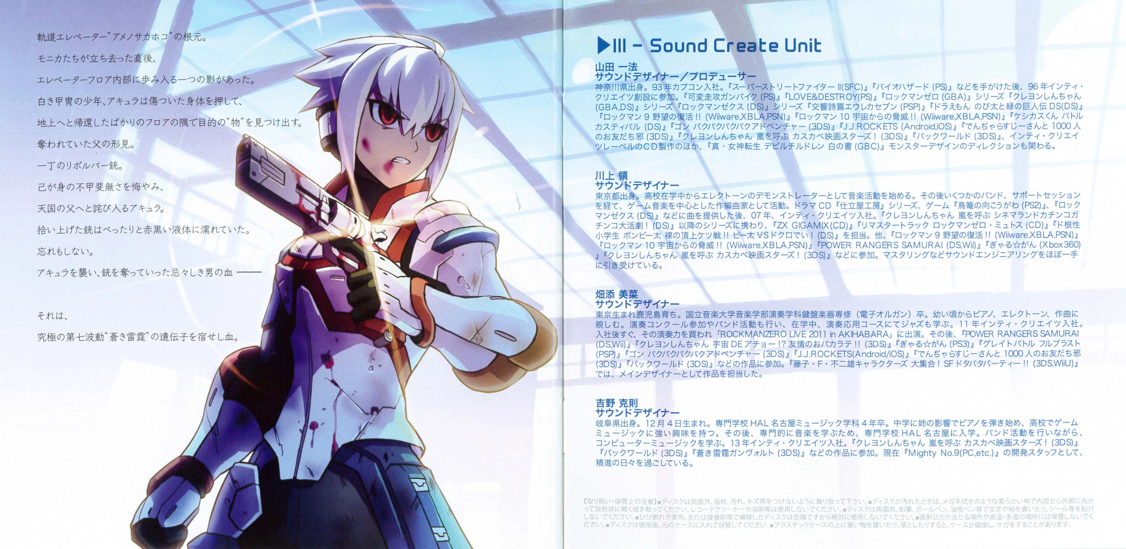 The Azure Striker Gunvolt Soundtrack (蒼き雷霆ガンヴォルト サウンドトラック Armed Blue Gunvolt Official Soundtrack) is an album made for Azure Striker Gunvolt. It contains all tracks from the game at the time of the soundtrack's release, including the game loop versions of the vocal songs, as well as a melody for the Sakurazaki Motors commercial mentioned in the game's "Talk Room." The soundtrack comes with a 16 page booklet listing who composed which track, notes for every track, general developer comments, character profiles, and an epilogue scene that didn't make it into the game.