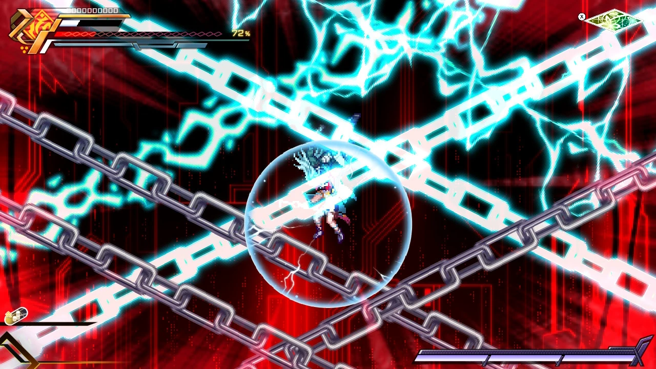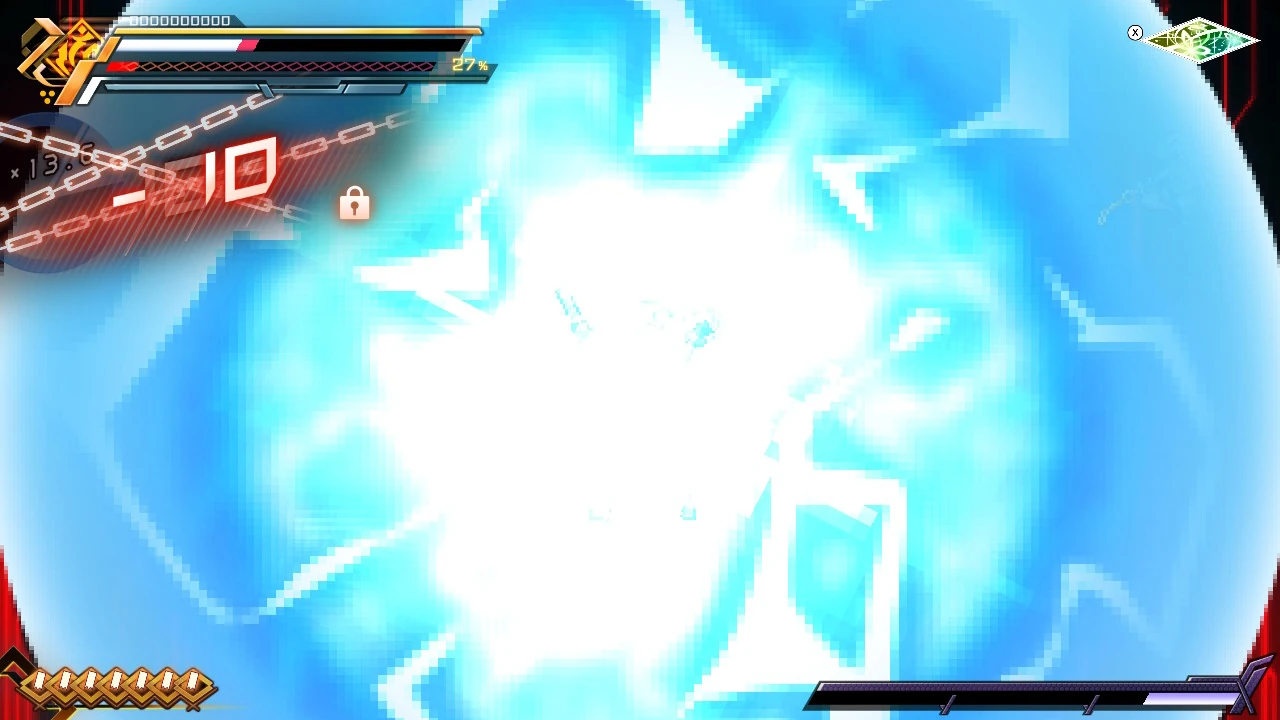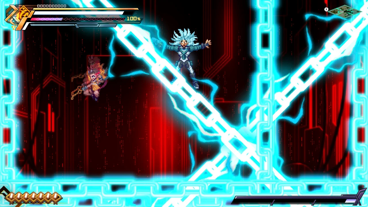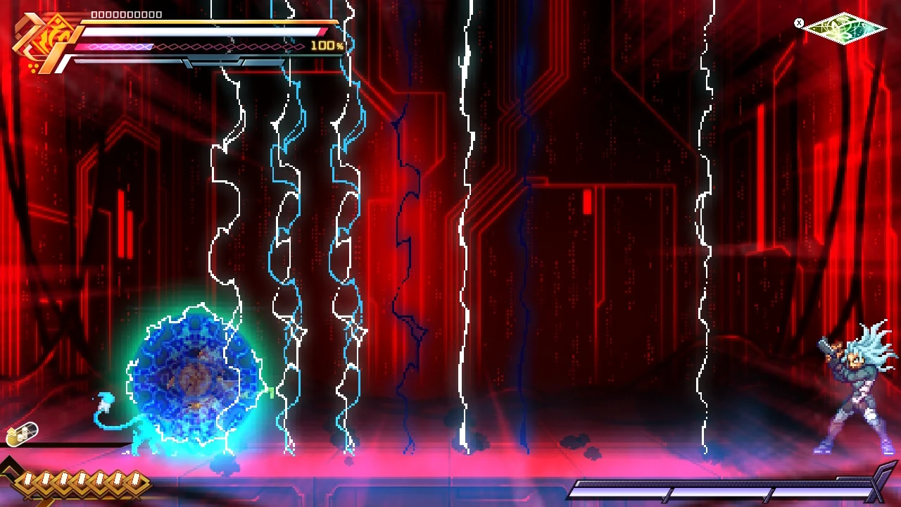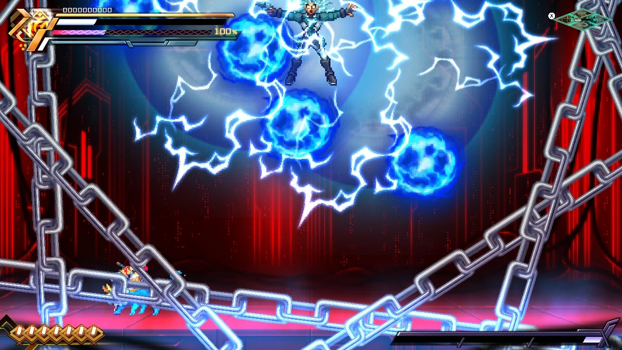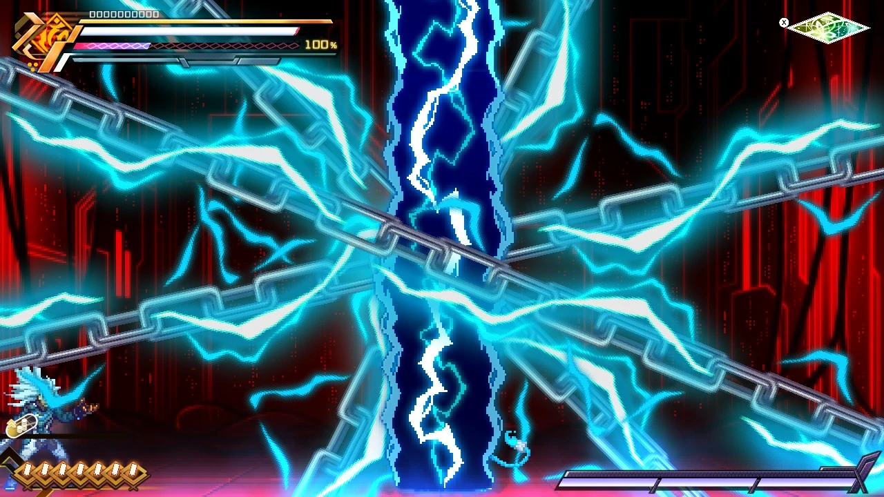 He can also punch the ground and channel lightning through it. His most powerful attack is the Voltaic Chains skill, where he deploys numerous electrified chains to ensnare and electrocute opponents. With this attack, he was able to nearly kill Copen and destroy his shield.