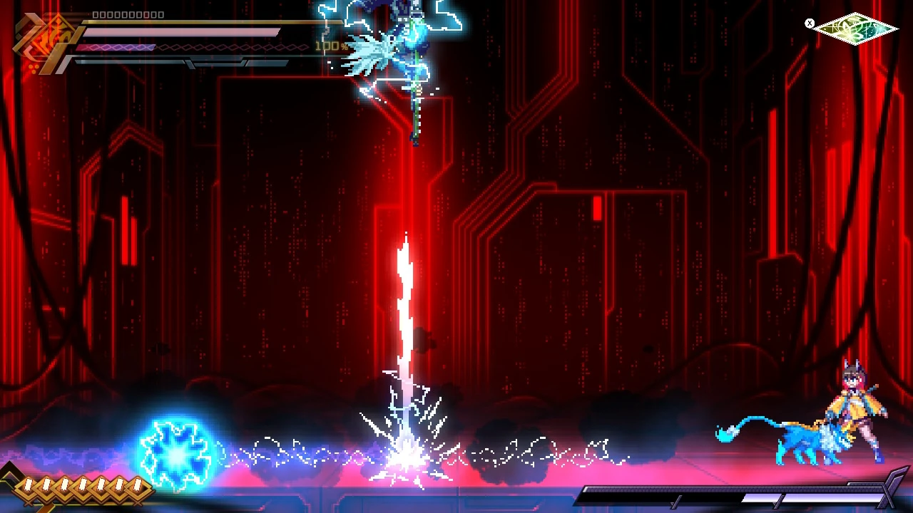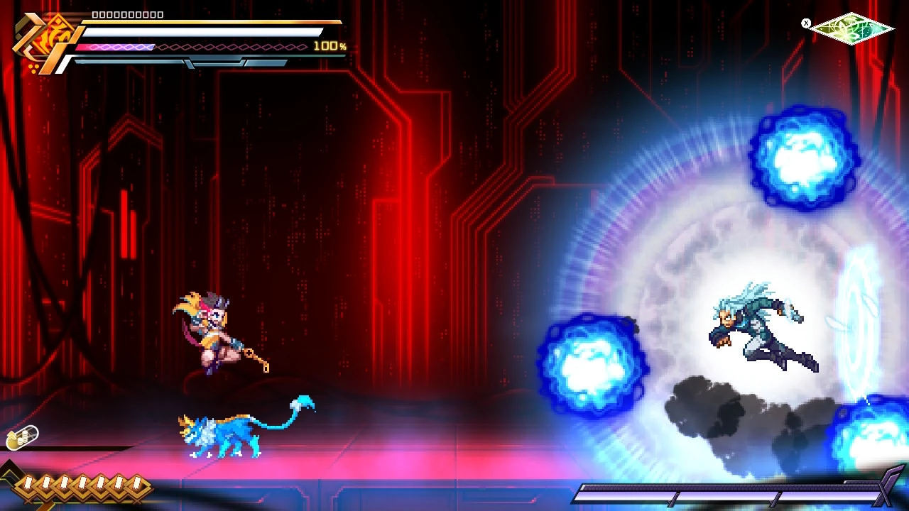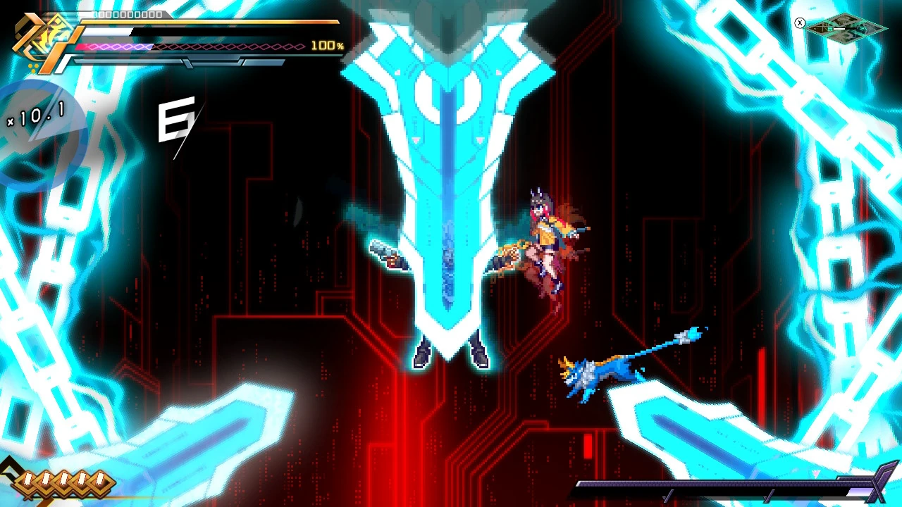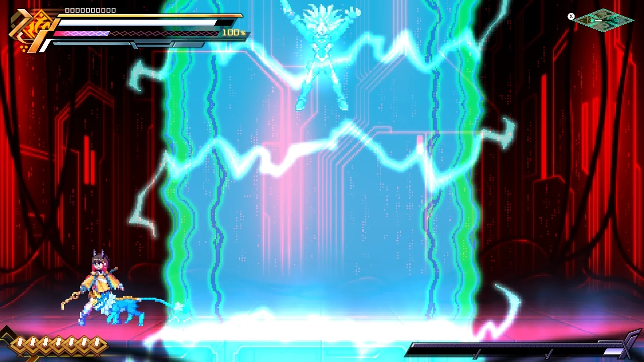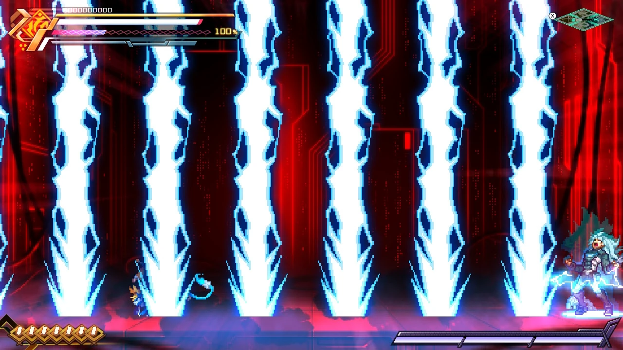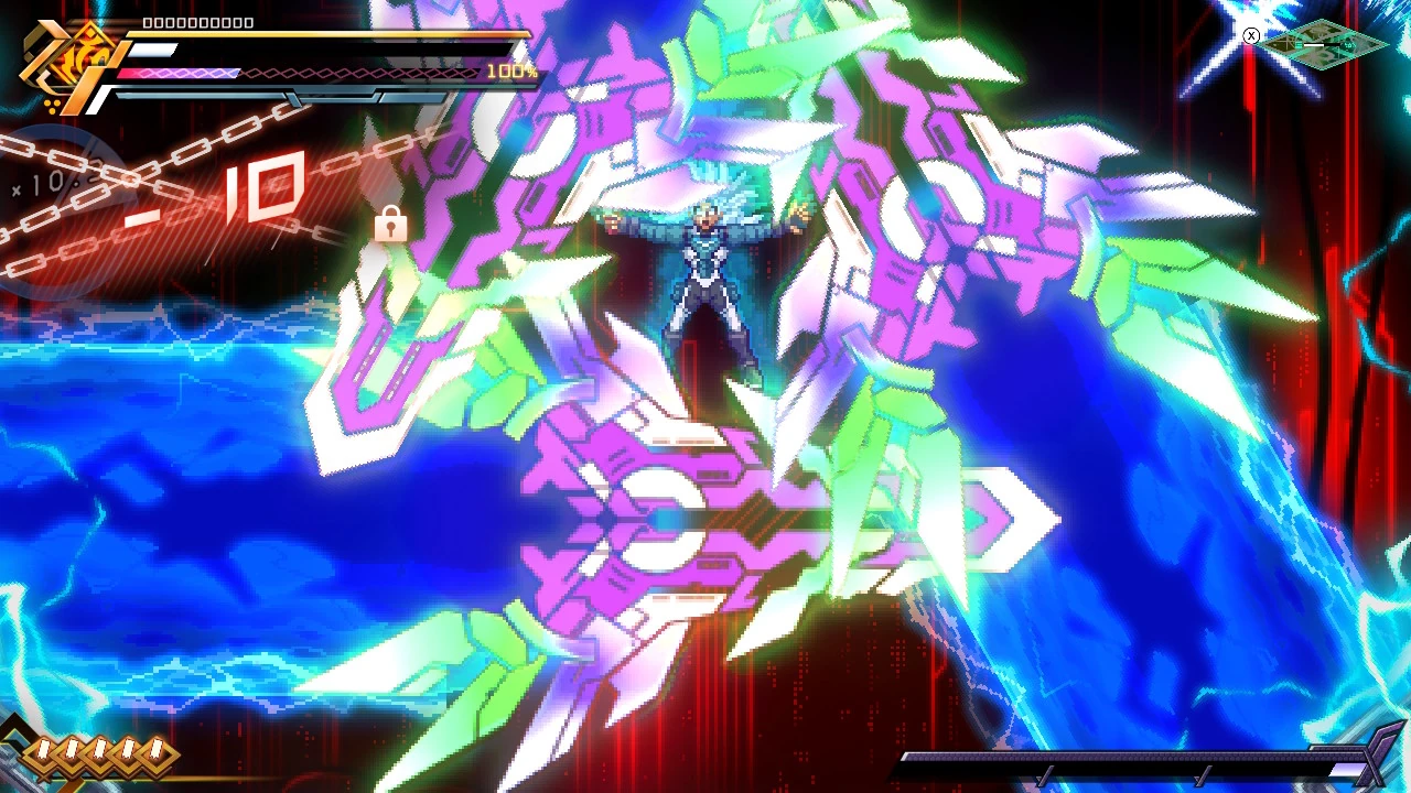 He can also punch the ground and channel lightning through it. His most powerful attack is the Voltaic Chains skill, where he deploys numerous electrified chains to ensnare and electrocute opponents. With this attack, he was able to nearly kill Copen and destroy his shield.