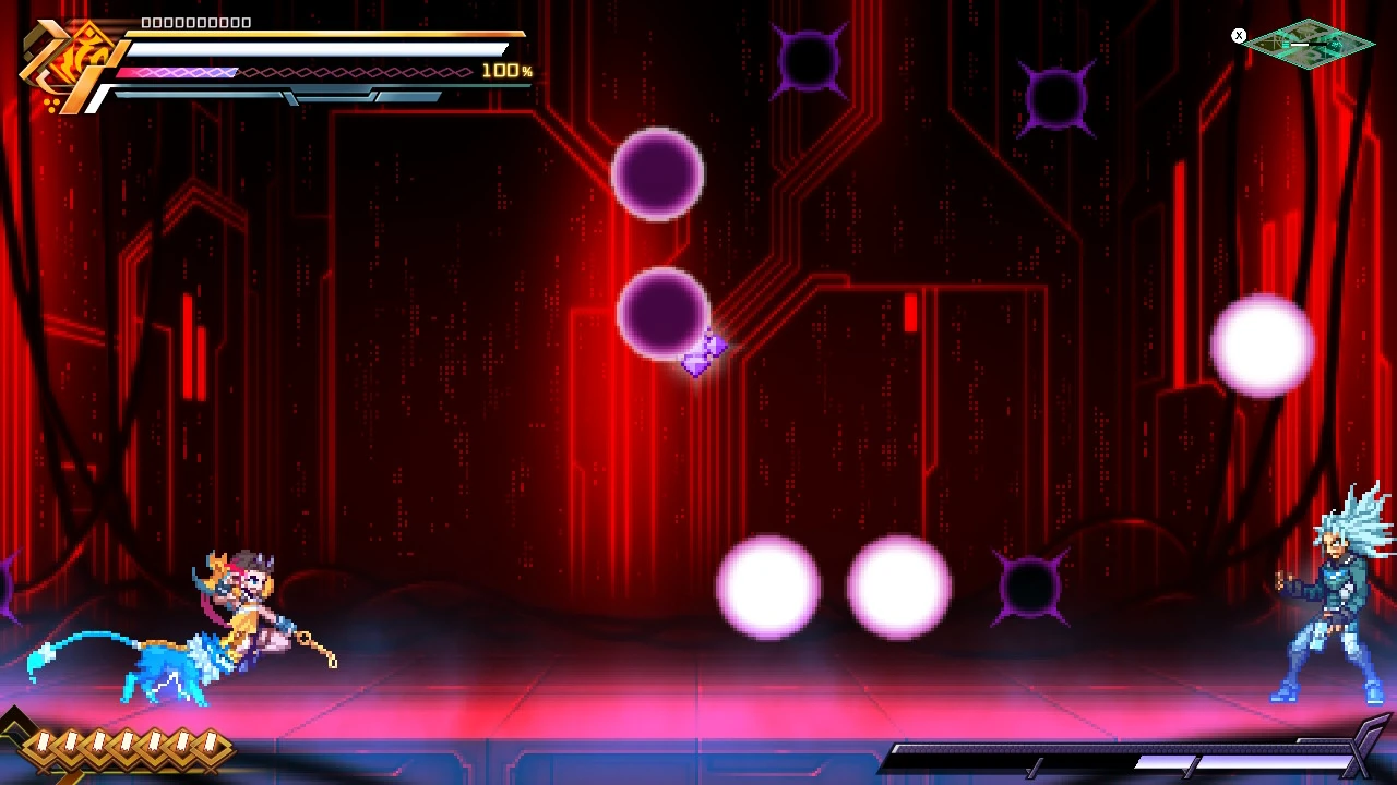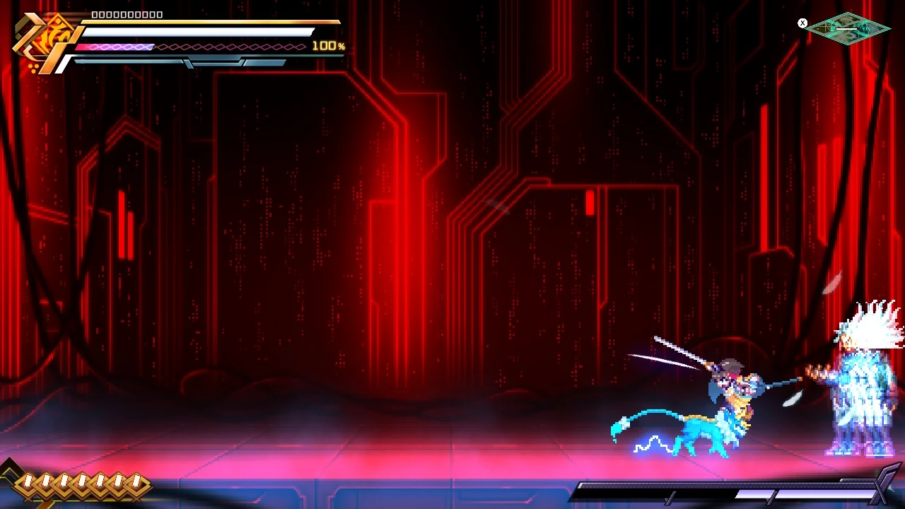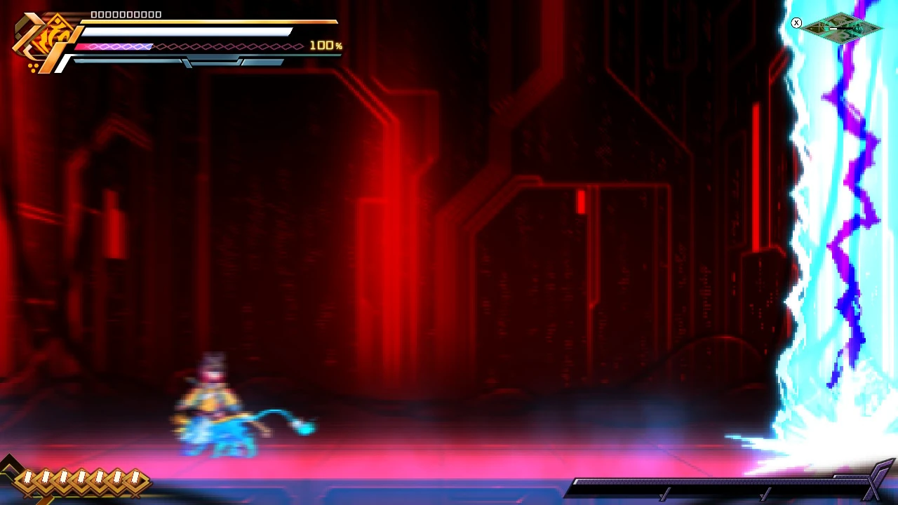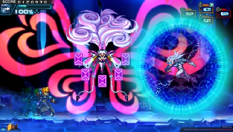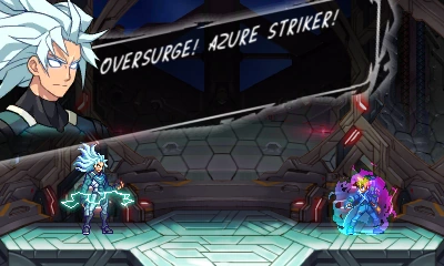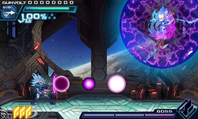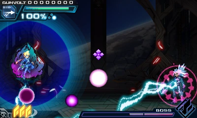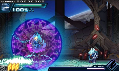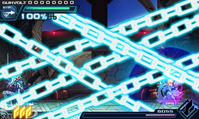 In battle, he can perform Prevasion, turning his body into electrons to become intangible and allow attacks to pass through him. He can also use the Flashfield, but can do so in a more offensive manner by charging at foes. But if he collides with Gunvolt's Flashfield, it will cause both of them to overheat, leaving him vulnerable.