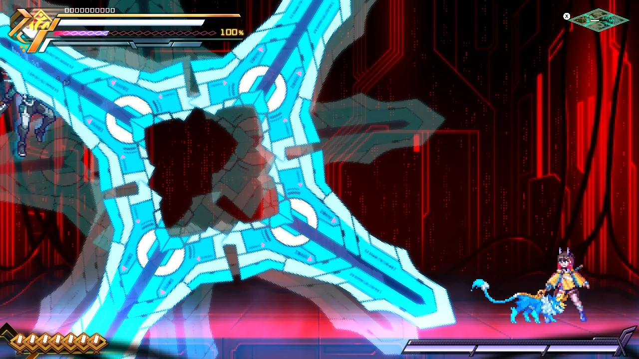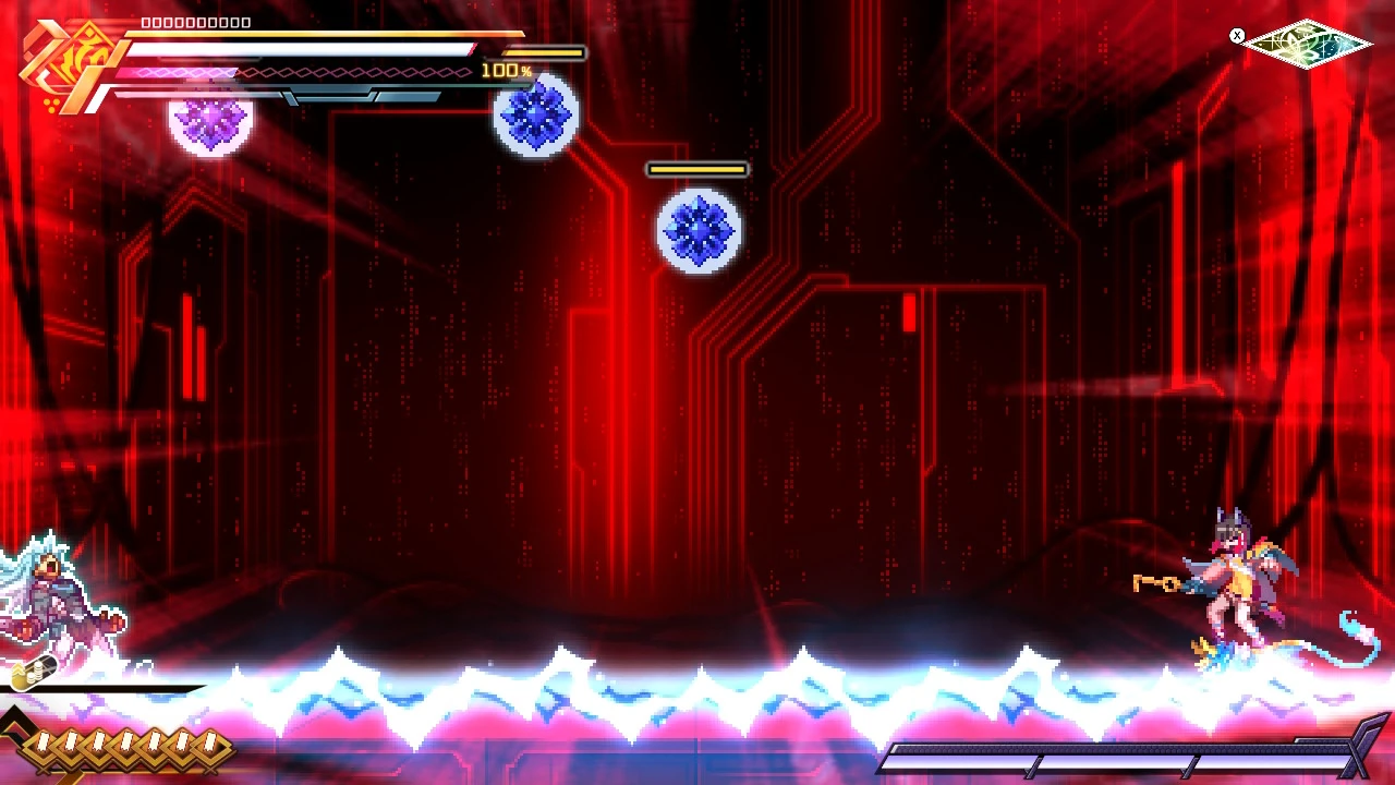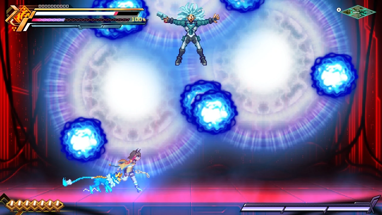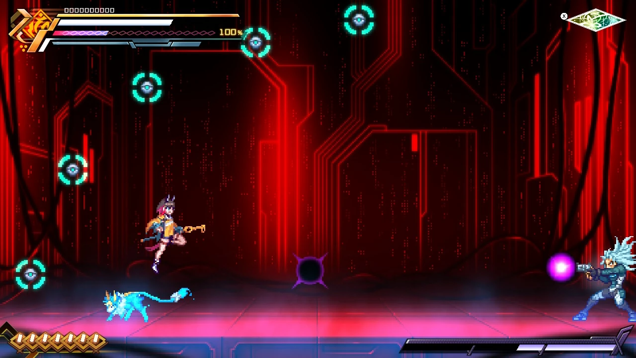 Asimov's standard attack. Asimov fires two waves of three magnetic bullets, which ignore Prevasion and inflict the Chaff debuff if they connect, freezing Gunvolt's EP at 0 for ten seconds.