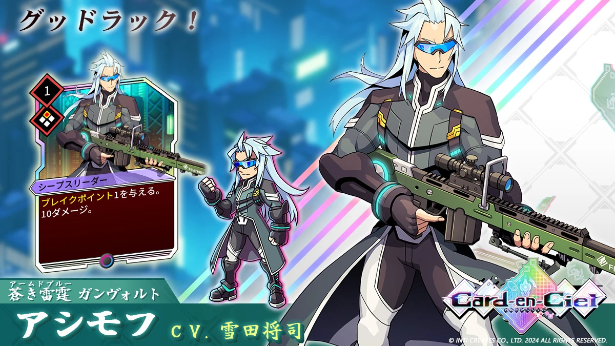 Asimov is one of the characters from the first Azure Striker Gunvolt featured in the crossover roguelite card-battling RPG Card-en-Ciel and its GV1 game world, appearing as both a card and an enemy.