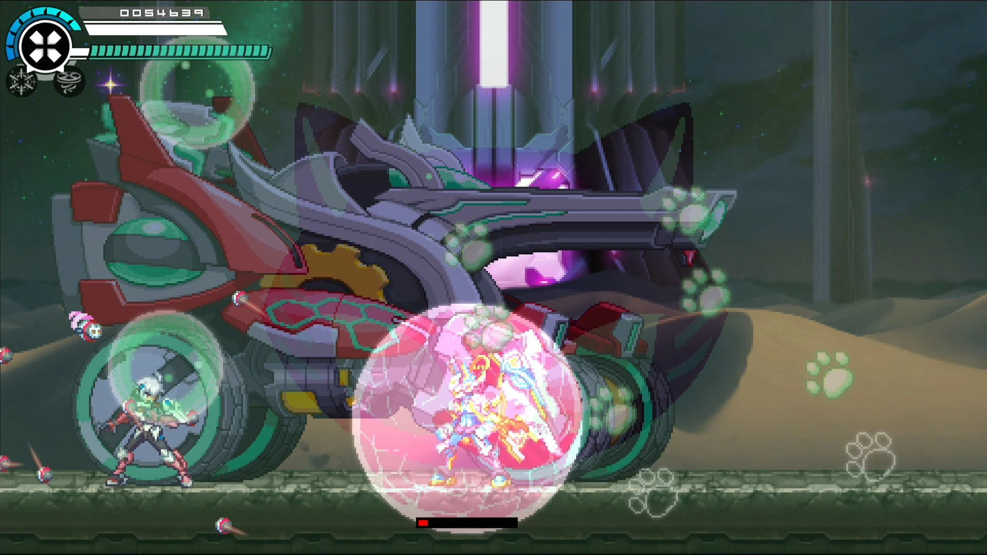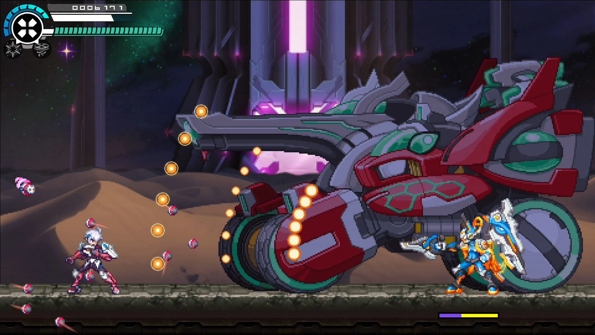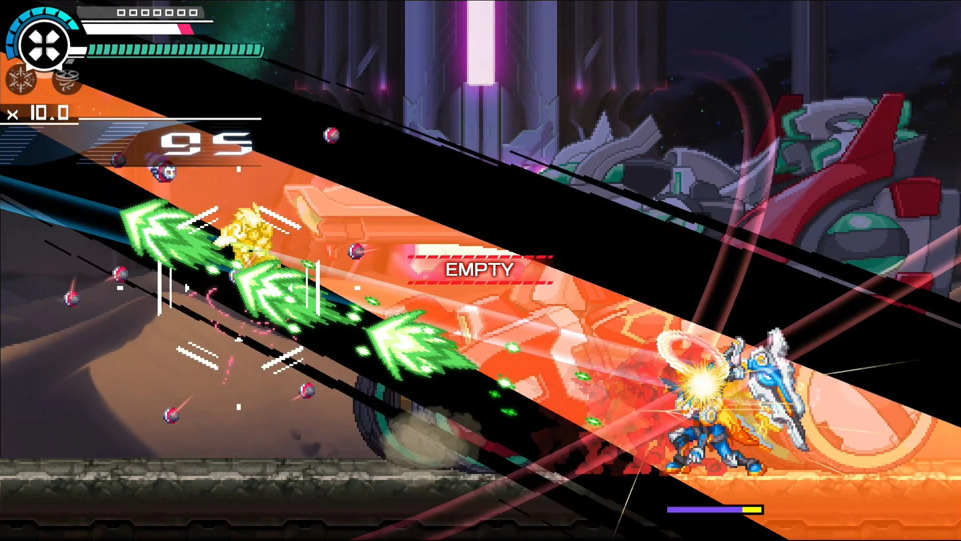 | Jumps into the air and fires three shots at Copen, then fires a grenade at the ground,Phase 2 replaces the grenade with an IX Shredder that tracks Copen.