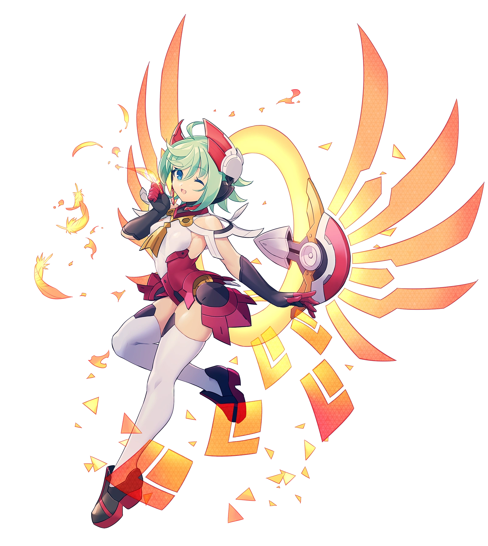 With the power of the Muse, Lola gains the ability to shift into what is known as her "Idol Mode". In this form, her appearance shifts to that of a young girl with short, mint green hair, and blue eyes. She wears a red and white leotard with bits of gold, and white knee-highs with black and red shoes, as well as black gloves with red fingers. She also has two white and red disc-like objects known as "Speaker Pods" that broadcast songs hovering behind her, joined together by a large orange ring. She also sprouts red wing-like holograms, which vaguely resemble phoenix wings.