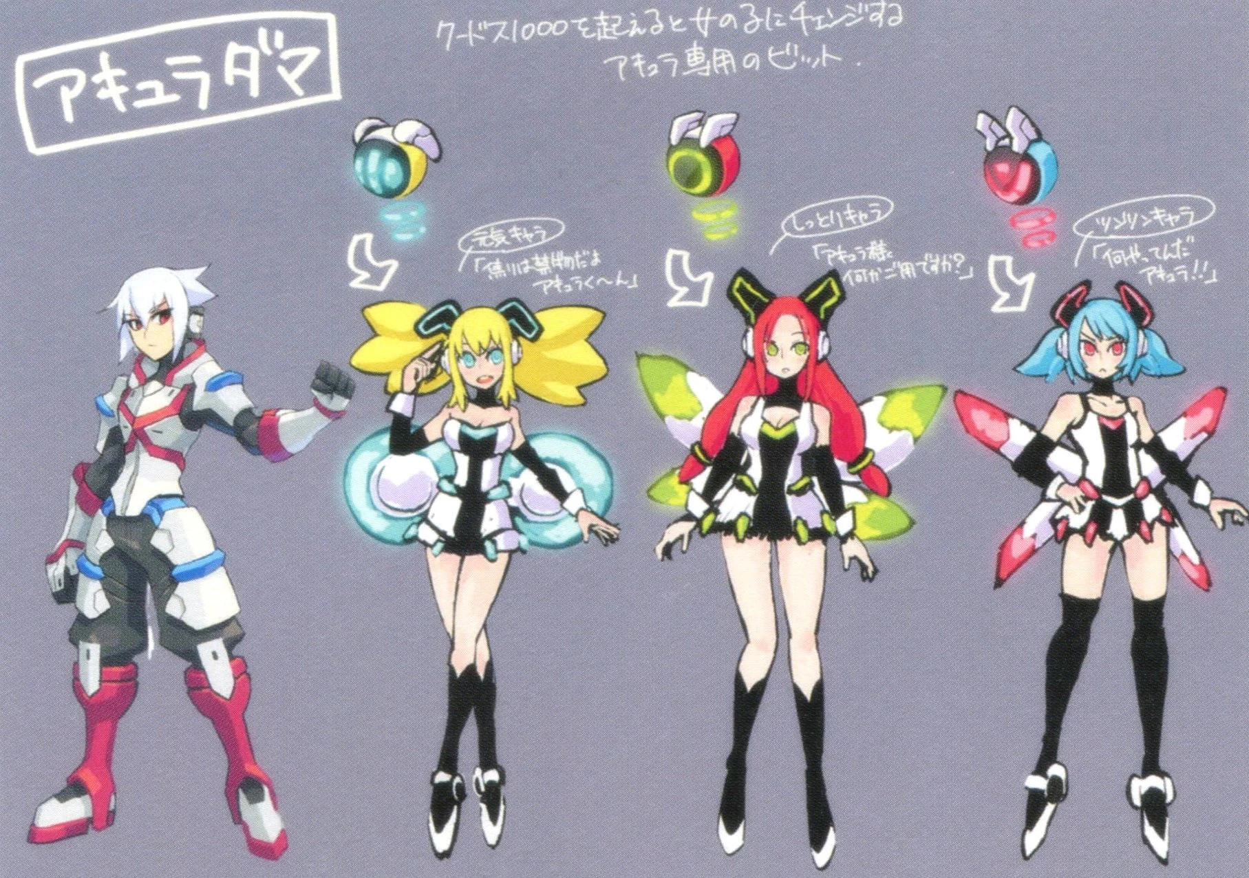 A combat support robot created by Copen. She is equipped with a scanning system capable of analyzing enemies' Septimas. She can then replicate mock versions of those Septimas as "EX Weapons", which Copen can use at his disposal. She is Copen's reliable partner.