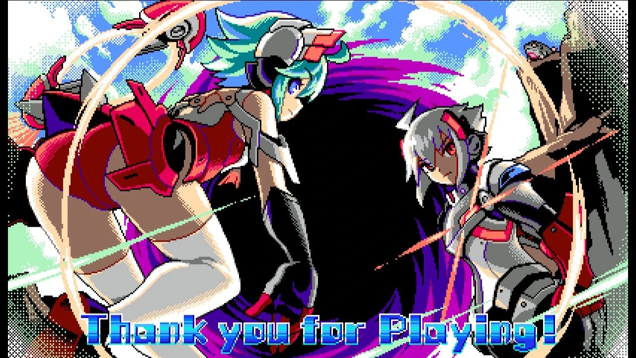 Upon reaching the depths of the facility, Copen and Lola come face-to-face with Demerzel and defeat it twice over. But the AI manages to strike Copen with a bolt of lightning, downing him. Lola tries to invoke the Anthem, but it fails to revive Copen. She too is struck by lightning and tumbles to the ground, barely functional. As Demerzel goes into stasis, Lola calls out begging for someone to help Copen. On the surface, Kohaku hears her. In the end, both Copen and Lola are rescued by Kohaku and Blade.