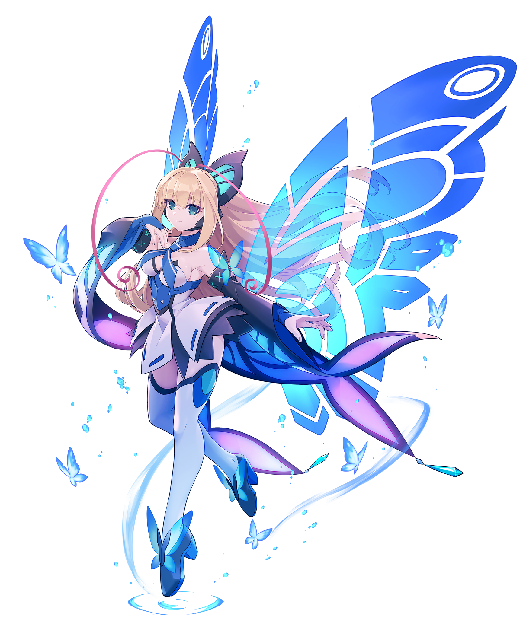 Lumen has long blonde hair, tied into a ponytail, with two pink strips that mimic a butterfly's antenna. On her head she wears a butterfly-shaped hairband, that also functions as headphones. She has rather large wings, gleaming blue with a sea blue on its borders and white details. She has a white dress with blue and purple stripes and white triangle details at the end of her skirt.