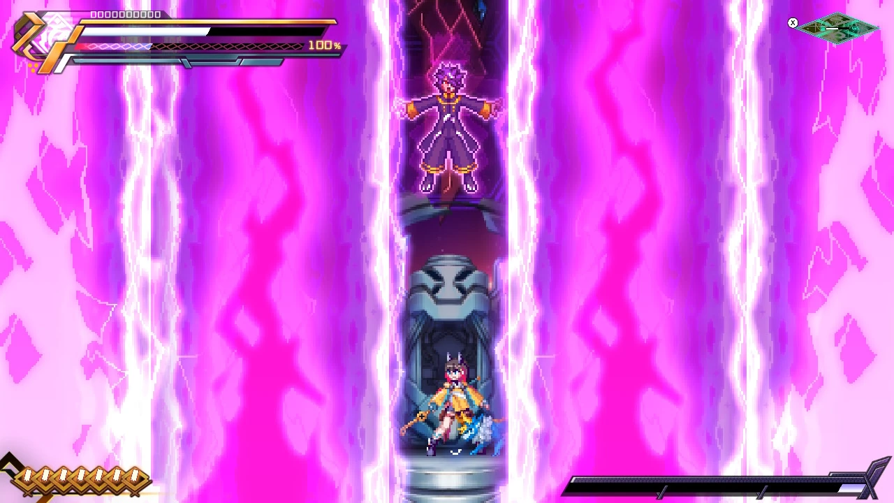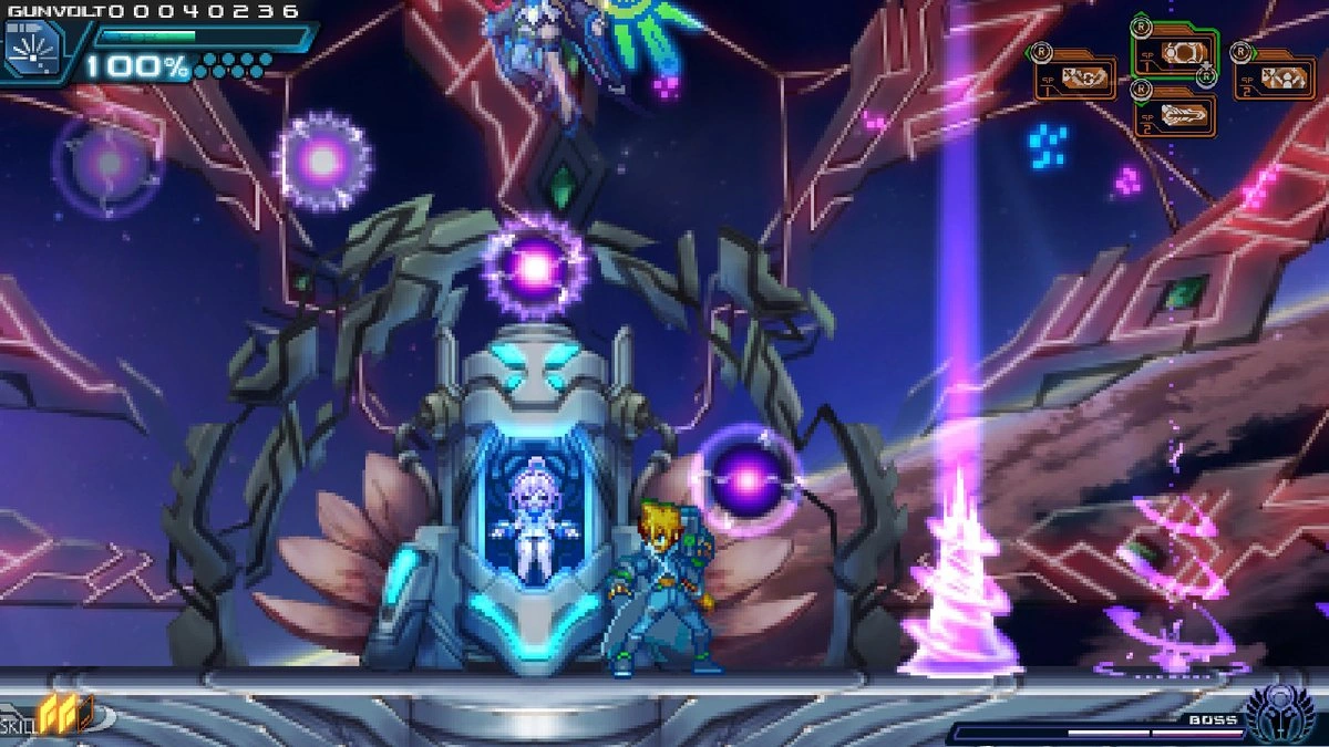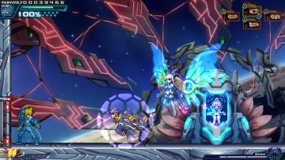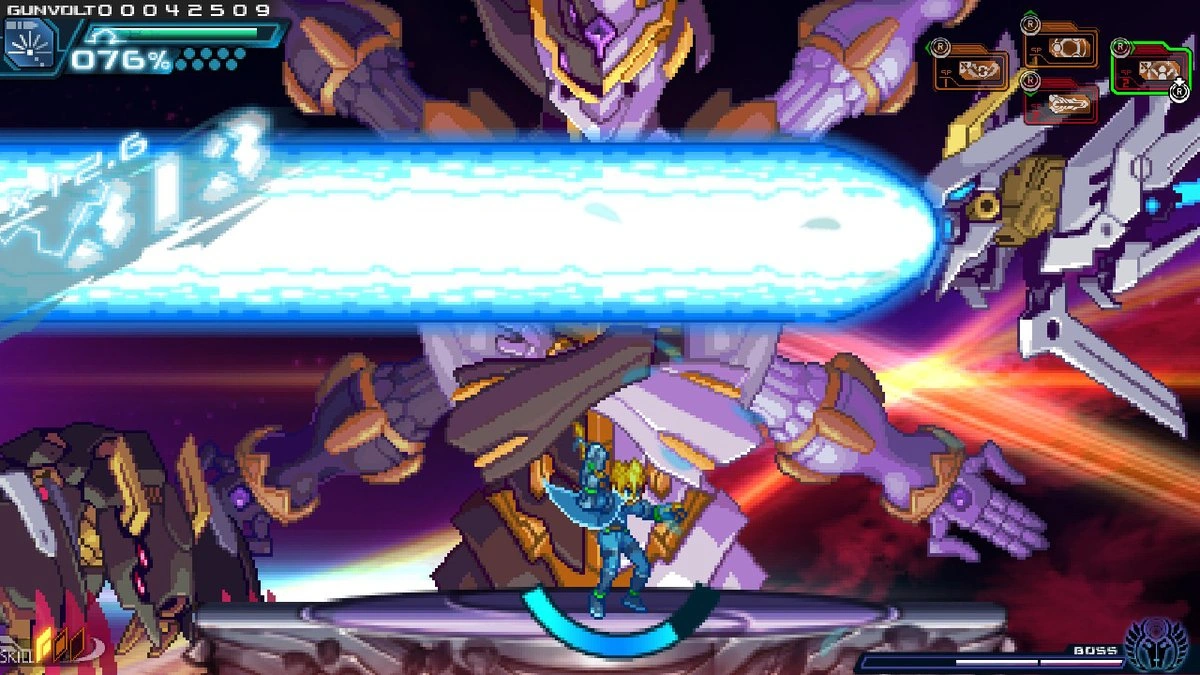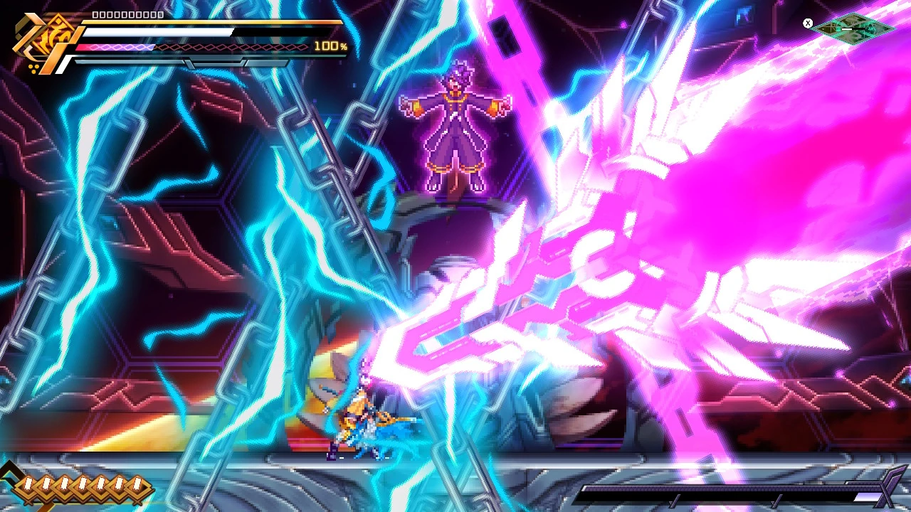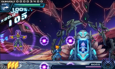 Amused by Gunvolt, Nova promises to deliver divine punishment upon him. However, despite Nova's immeasurable power, he is eventually defeated.