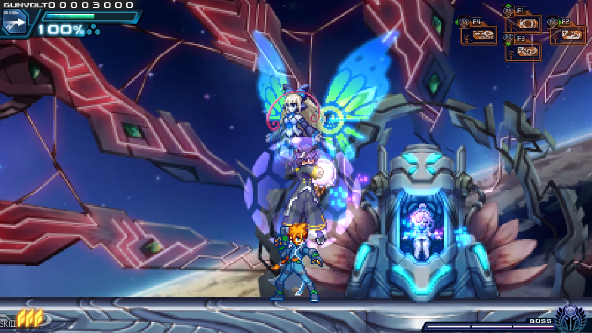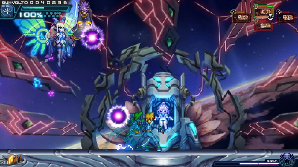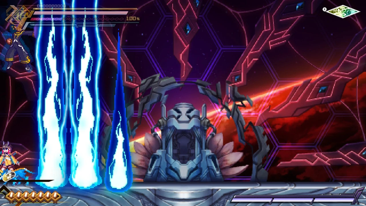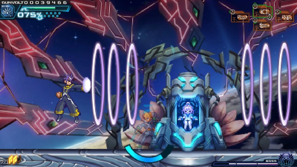 Amused by Gunvolt, Nova promises to deliver divine punishment upon him. However, despite Nova's immeasurable power, he is eventually defeated.