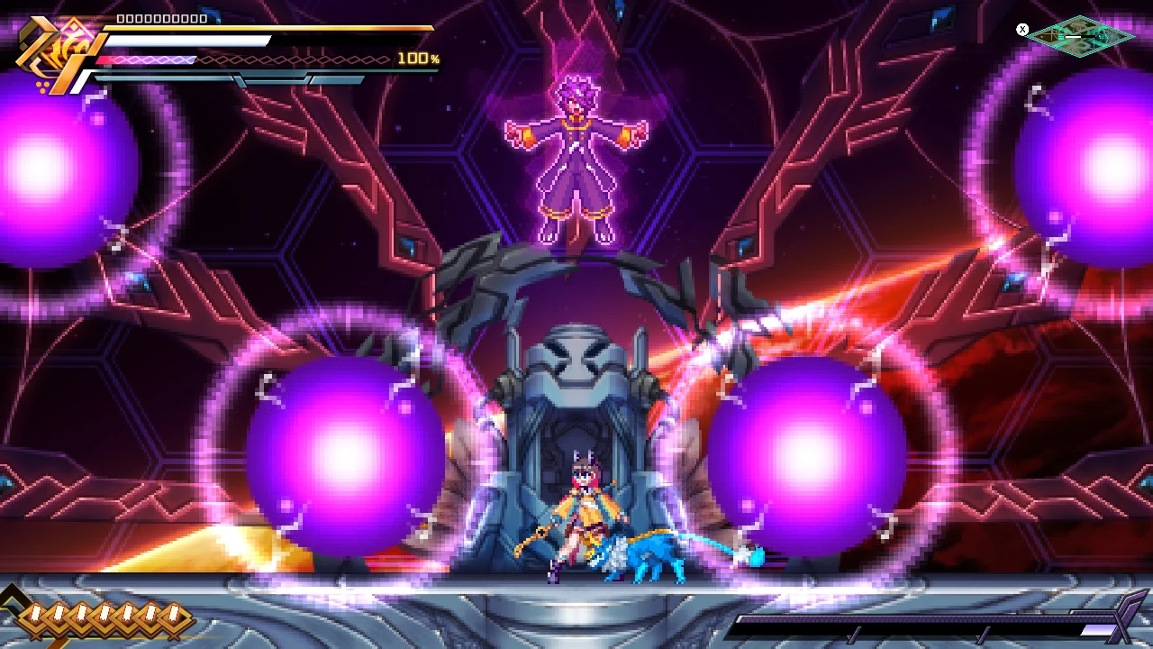 His battle concept is “a boss fought with the Flashfield and close quarters combat”, but this is actually an idea that was initially meant to be used with Stratos’ battle. Due to some reasons, the idea was discarded so I repurposed it for Nova. If we weren’t that close to making the master (ROM) when I wrote his planning, I might’ve made the battle different yet… But I didn’t have any time for that. It ultimately fits very well with the development of the plot, so that makes him one of my favorite bosses. I did have some reservations about calling purple spheres a form of psychokinesis nowadays, but since purple balls being that power is a staple, I went with it! I easily wrote that in the plan, and the result was such a cool boss, I’m so surprised at that.