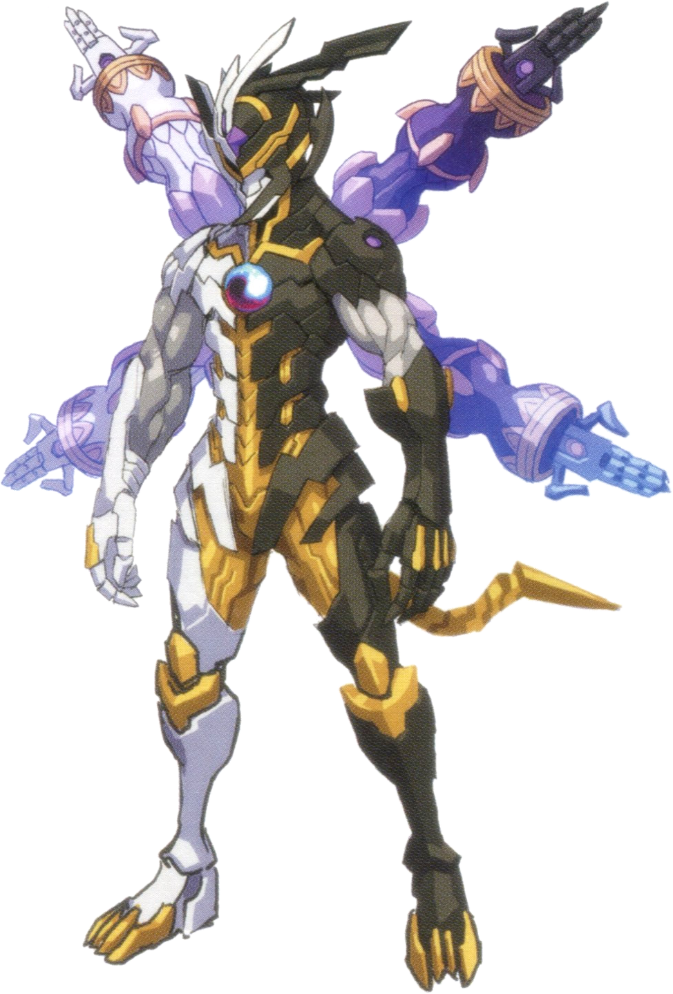 He’s the bad guys’ boss so I prioritized giving him an elite-like and full of finesse feeling. Him being slender and androgynous is because I wanted him to give off the impression that he’s come this far by intelligence and abilities, and not his strength: that’s where it comes from. I wished his post-transformation form to have a feeling of the strongest and divine, fitting for a last boss, and thus I choose a Buddha statue as a motif. The colors cleanly splitting in the center (of his body) comes from the image of him being like an ultimate existence in which both light and darkness are in complete harmony.