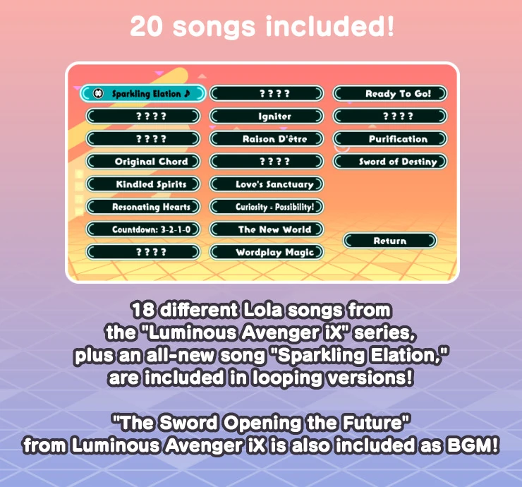 PuzzMiX (ロロパズミクス, RoRo PuzzMiX) is a suika puzzle game featuring Lola from the Luminous Avenger iX series. There are 12 forms of Lola in the game and they are from smallest to largest: default, Cryo-Flash, Doomsday Charge, Orbital Edge, Optic Barrier, Muse's Kiss, Anchor Nexus, Whirling Chopper, Rolling Ripper, Darkness Trigger, the Giant Lola tank, and Muse Lola.