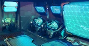 Although the name QUILL has become hundred year old history and Copen only mentions them in passing as a terrorist organization, Asimov--now going by the name Demerzel and having transcended his physical body--appears to still have strong attachments to the group's legacy. QUILL's logo can be faintly seen in the background in the innermost depths of his bunker, and the logo is emblazoned on his electron body's container as he recovers in sleep mode. He even went as far as to name the Sumeragi Institute's elite Adepts "Falcons" (翼戦士, Winged Warriors) and commission the Falcon Quills, feather shaped pens and successors to Glaive technology, to give to them to carry out his agenda.