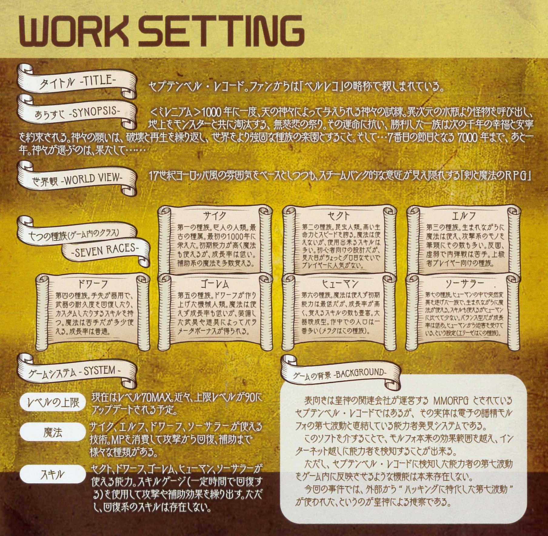 September Record (セプテンベル・レコード), or Ber-Rec (ベルレコ) for short, was an in-universe MMORPG developed and run by one of the Sumeragi Group's subsidies at the request of Merak, who secretly controls the game and can manipulate its functions as he wishes. Appearing to be a normal online game, in truth it was a system used to attract and detect Adepts over the internet; Joule's electronic septima The Muse aka Lumen was a central component of the game system, and Lumen frequently made live singing appearances within the game (which Merak noted was completely unrelated to the game's setting). Gunvolt freeing Joule at the beginning of Azure Striker Gunvolt caused the game to crash, and Sumeragi publicly blamed this outage on a hacking attack.