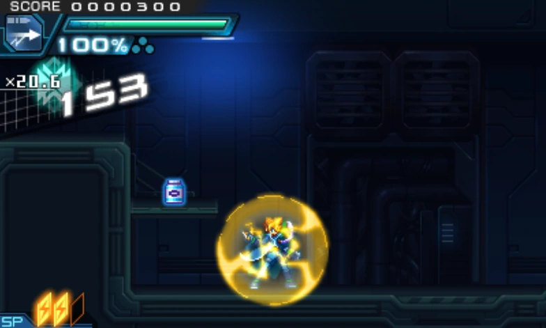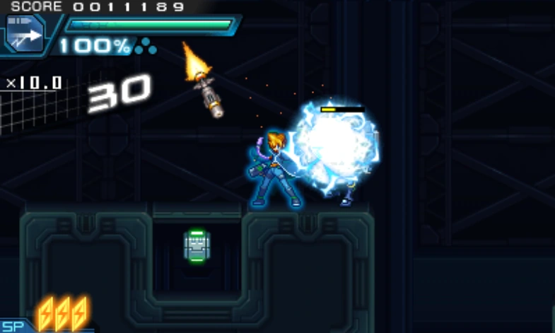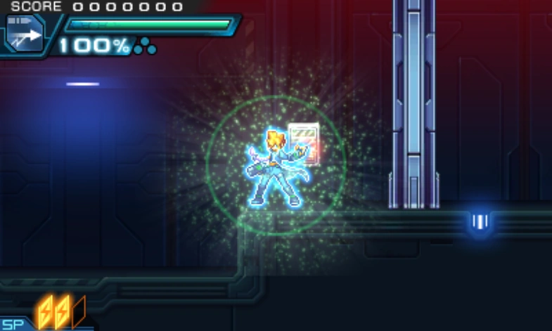 A lightning bolt strikes Gunvolt, hitting nearby enemies and any enemies above or below Gunvolt. Exclusive to GV2 and the Trilogy Enhanced version of GV1.