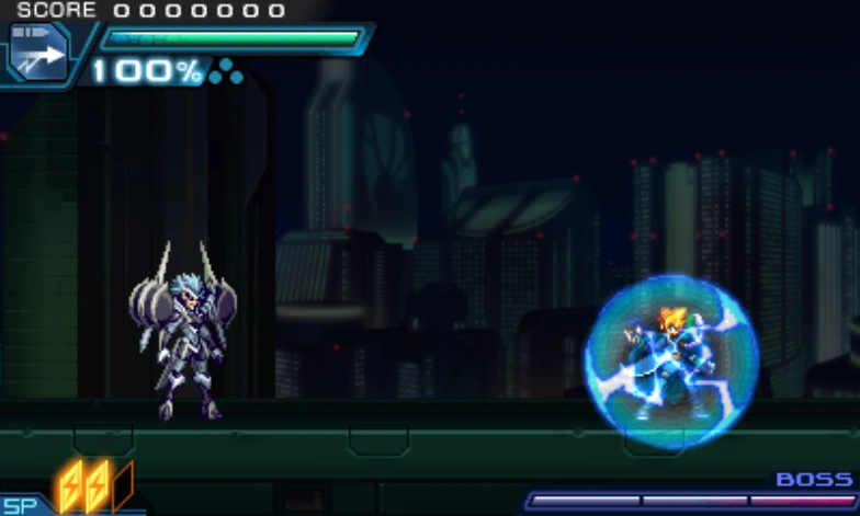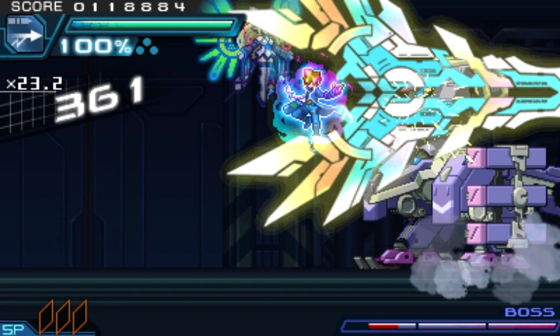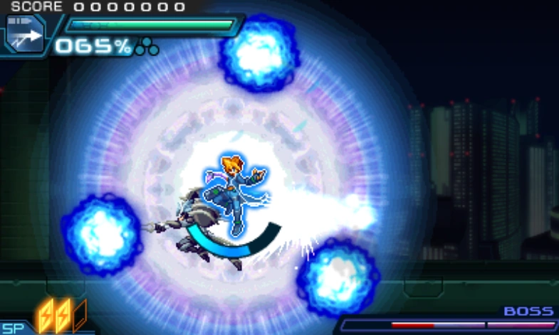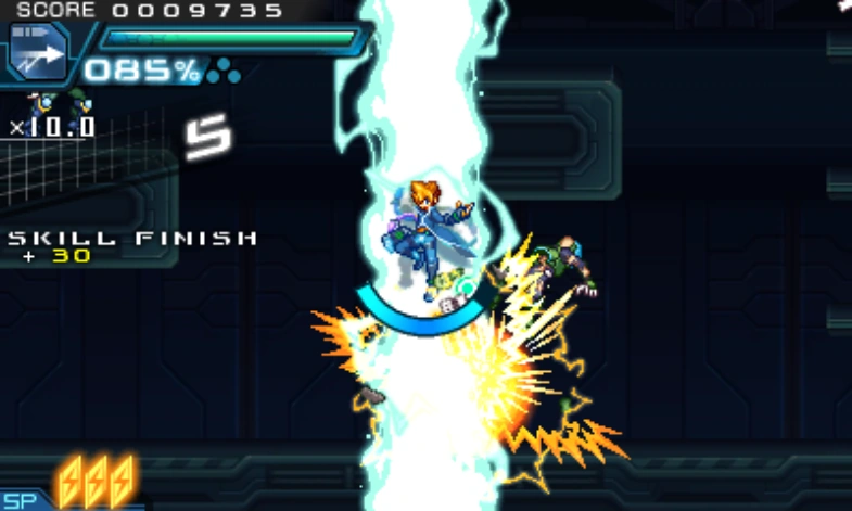 Defeating a foe with an Offensive Skill yields a Skill Finish bonus, which is small or nonexistent for normal enemies but large for bosses. Most of the time, obtaining this bonus on mid-stage bosses is not worth the cost of banking Kudos. However, Gunvolt in GV2 and GV1 TE can use a 0 SP Skill to get the bonus without banking Kudos, and in GV3, any character can do this with any skill.