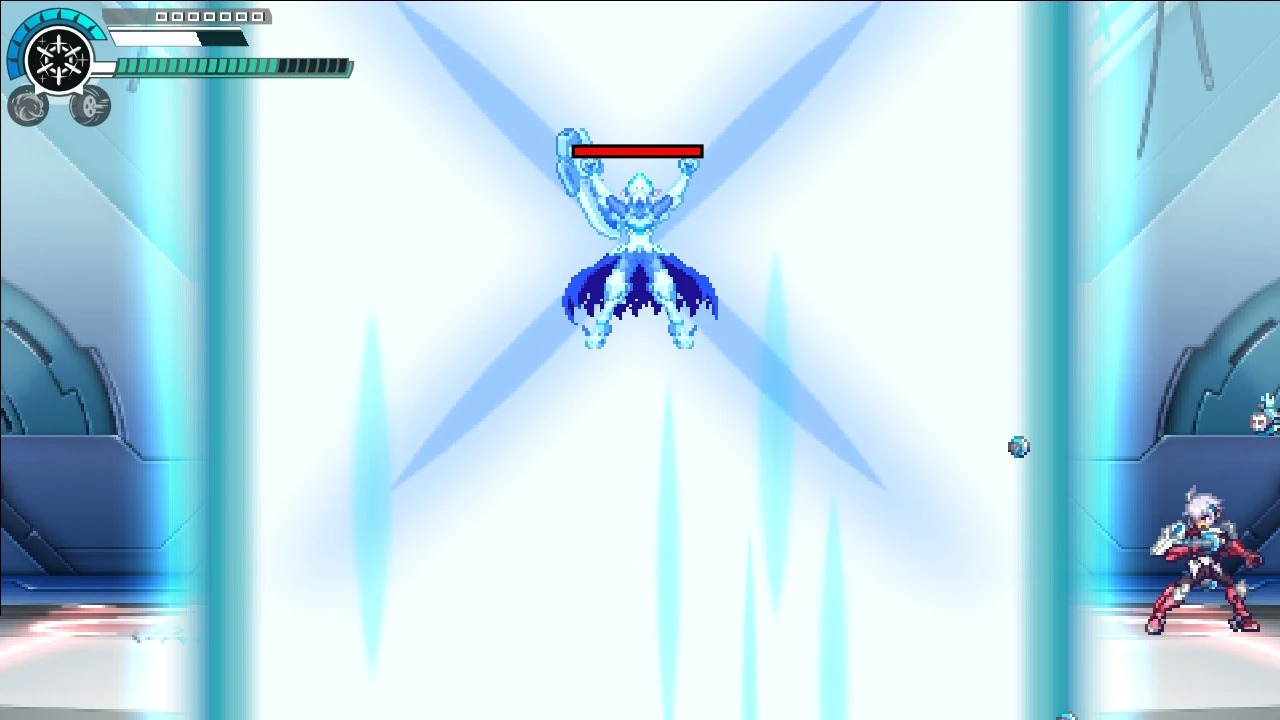 An SP Skill used in his final fight. He calls upon the souls of the six Gravekeepers to attack Copen before unleashing a massive blast of light. The orbs that he summon must be destroyed before they become wings to lessen the first attack by using the Gravekeepers' Hard Mode weaknesses. |