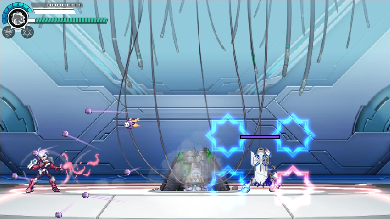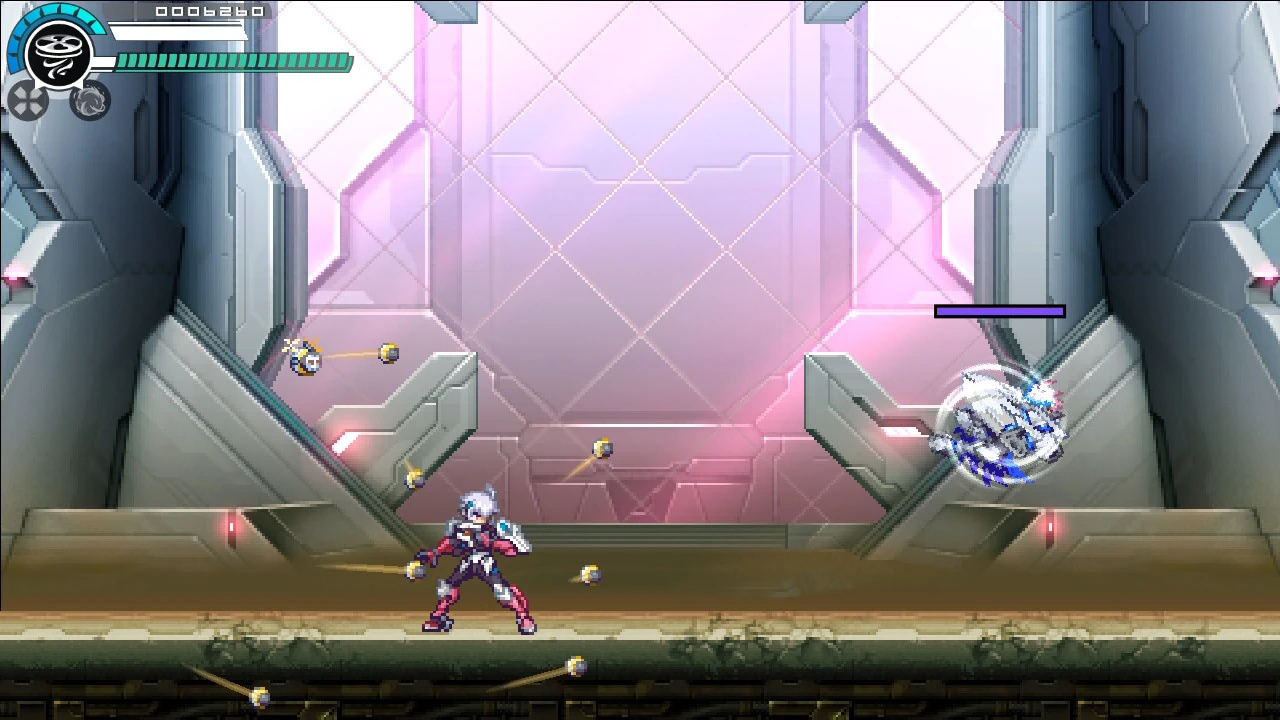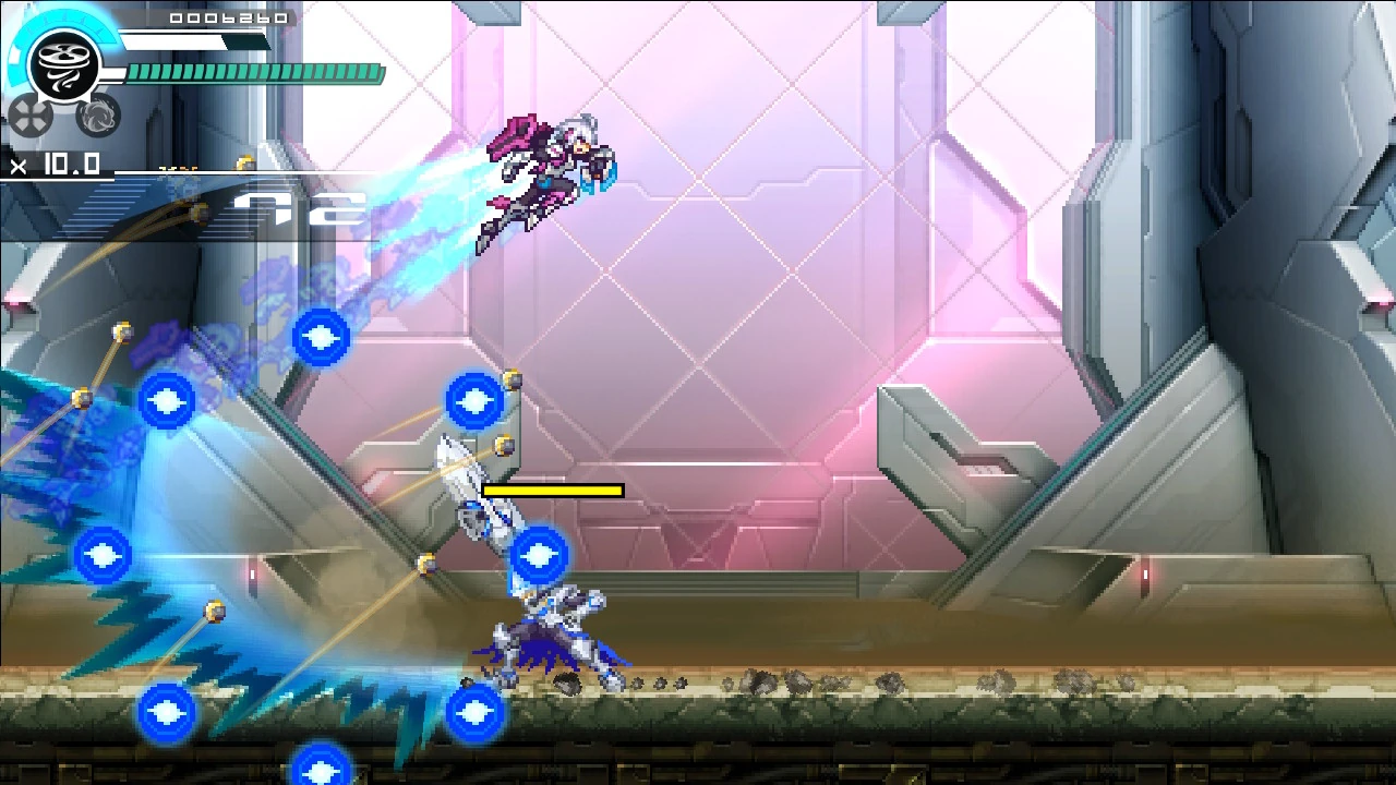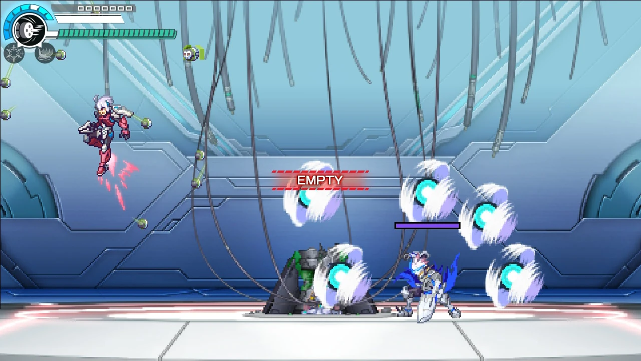 A move copied from Vespa. He fires 5 wind projectiles at Copen. Unlike Ypsilon, the order of the projectiles moving towards Copen are random. |