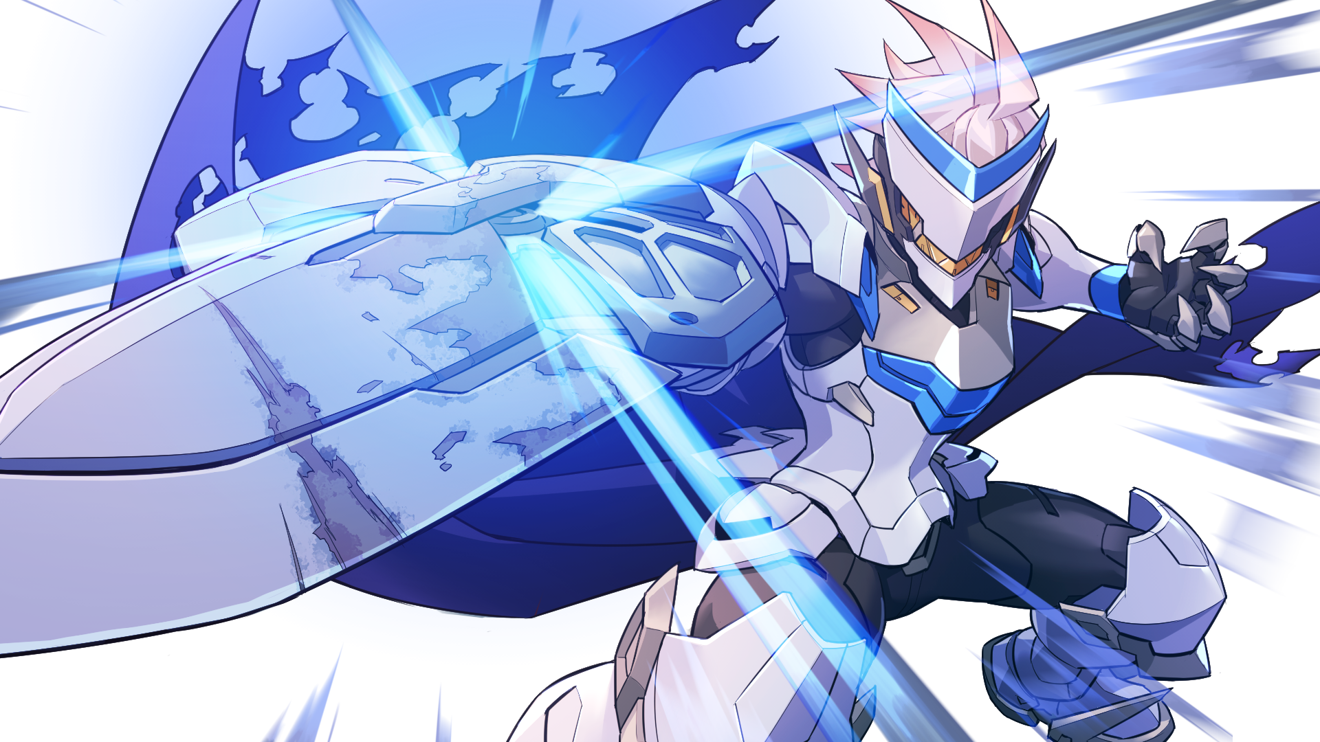 He swings his shield, creating a large slash and sending 8 azure energy balls flies outward. In 2nd and 3rd fights this skill cancels Cryo-Flash, and he will use it if not in the middle of another attack. |