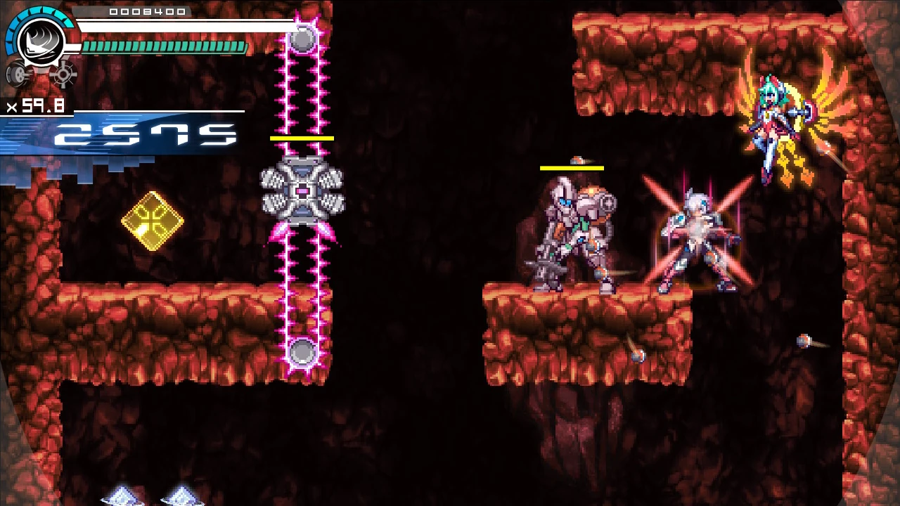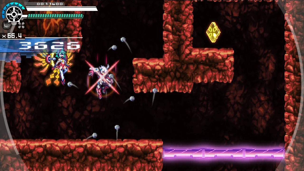 The magma is not instantly lethal, and Copen can enter it similar to water in past games. While submerged, he will repeatedly take high damage. This increases the difficulty of collecting all the Bonus Emblems.